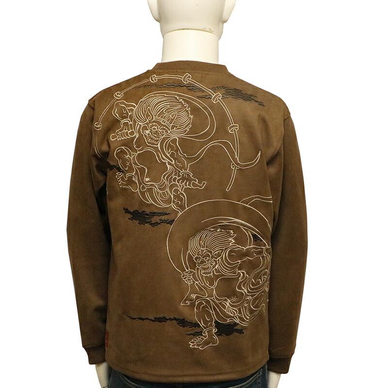 風神雷神 柄 刺繍 フェイクスエード 和柄 長袖Tシャツ