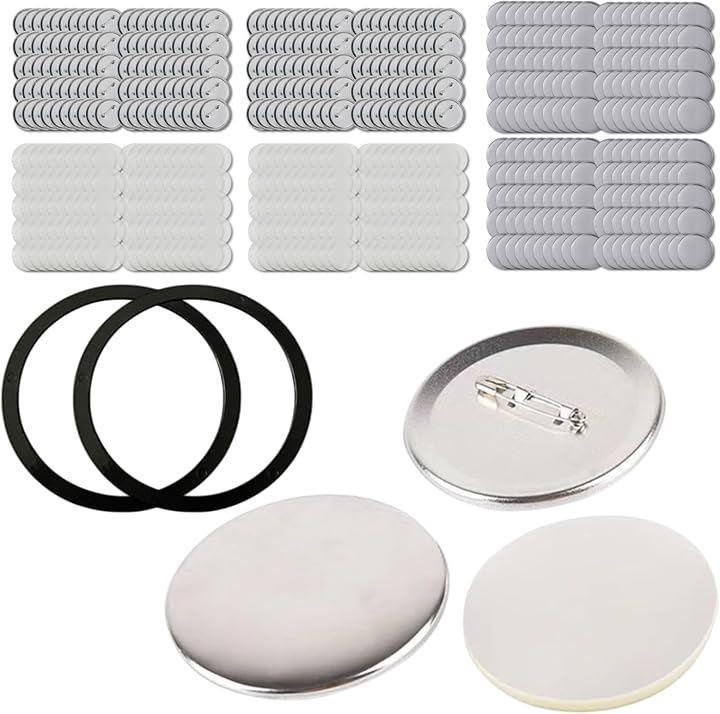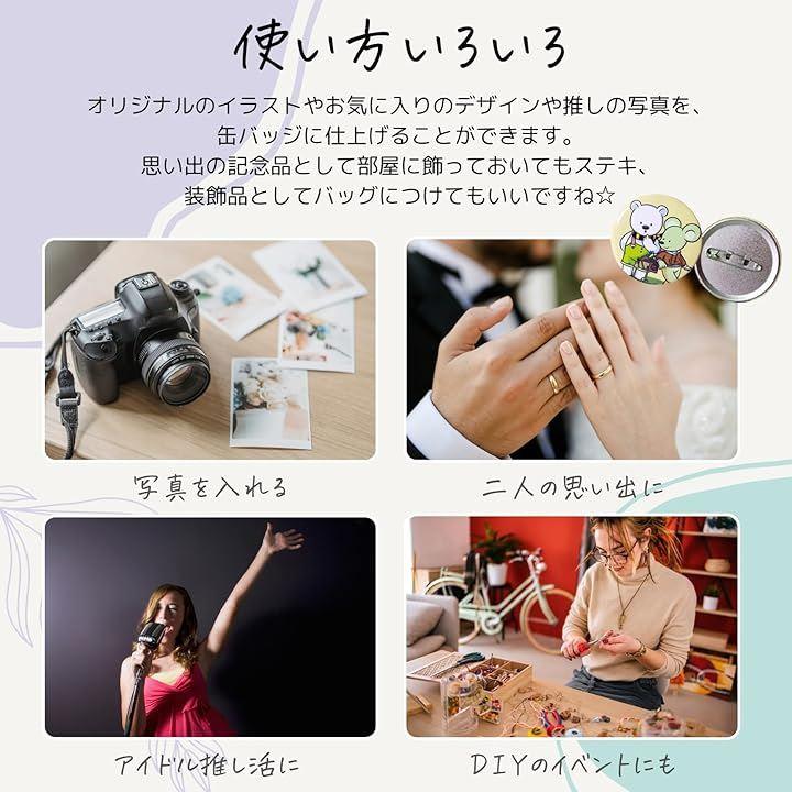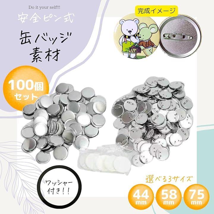 サイズバリエーション豊富。「セット内容」:缶バッジシェルx100 ピンバックx100 バッジフィルムx100 ガスケット(ワッシャー)x1「入り数」:各100個セット各/200個セット/各300個セット「サイズ」:44MM 58MM 75MM「素材」:ブリキ