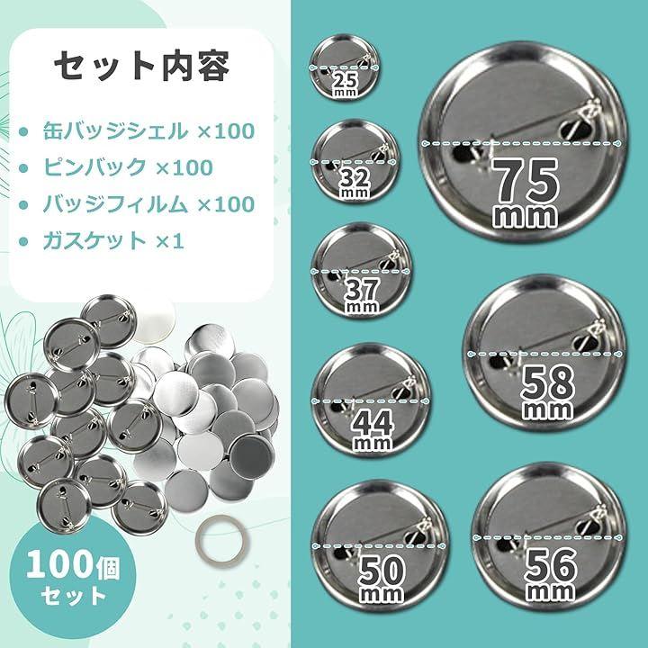 「サイズ豊富」「セット内容」: 缶バッジシェルx100 ピンバックx100 バッジフィルムx100+ガスケット(ワッシャー)x1「入り数」:各100個セット/各200個セット/各300個セット「サイズ」: 直径25mm / 32mm / 37mm / 44mm / 50mm / 56mm / 58mm / 75mm「材質」: ブリキ