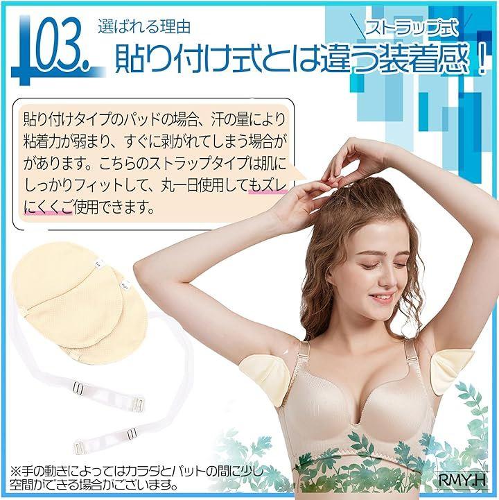 「快適。装着感」貼り付けタイプのパッドの場合、汗の量により粘着力が弱まり、すぐに剥がれてしまう場合がありますが、ストラップタイプの脇汗パッドは肌にしっかりフィットして丸一日使用してもズレることなくご使用できます。