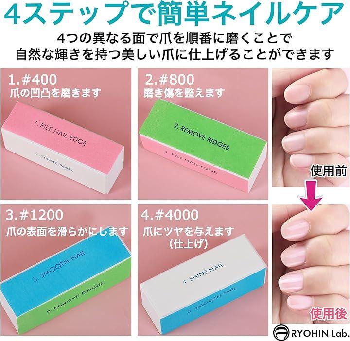 「4ステップで簡単ネイルケア」ブロック型の爪磨きセットを使って、4つの異なる面で爪を順番に磨くことで、自然な輝きを持つ美しい爪に仕上げることができます。