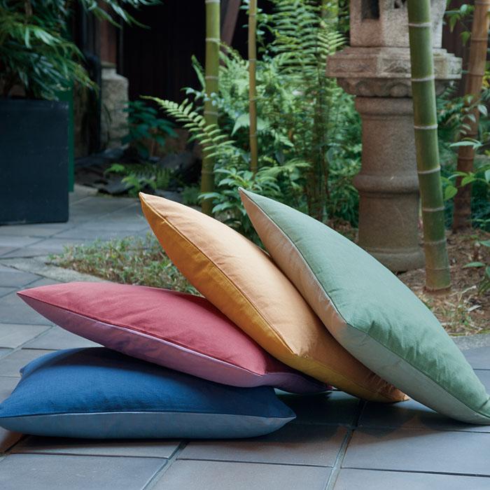 四季の移ろい捉えたような日本古来の色は、風情ある自然の色を映しています。同系色の落ち着いた深い色と優しい淡い色の組み合わせのリバーシブル仕様は、その日の気分や使う場所で色を変えて頂くと普段の暮らしのスパイスとなります。心を和ませる色のバリエーションは全5種類をご用意しました。異なる太さの糸を使い平織りとなな子織りを組み合わせて織られたブッチャー生地は、交叉する糸の凹凸が染め色に陰影を落とし深みを加えます。しっかり柔らかな手触りが心地よく、無地でありながら織り糸の表情が感じられる素材です。【カバーサイズ】 横55㎝×縦59㎝【生地素材】 綿(ブッチャー)100%この商品はカバー(ファスナー加工)のみです。中わたは別途ご購入ください。またカートの購入可能数より多い数をご希望の場合はご相談ください。