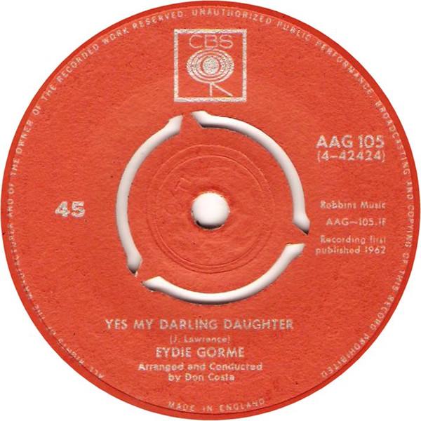 ・アーティストEydie Gorm?・タイトルYes My Darling Daughter・レーベル・型番CBS AAG105・フォーマット7インチレコード・コンディション(盤)良い (VG+)・コンディション(ジャケット)プレインカバー(元ジャケット/カバー無し)・コンディション(帯)オビなし・特記事項【盤曇り】