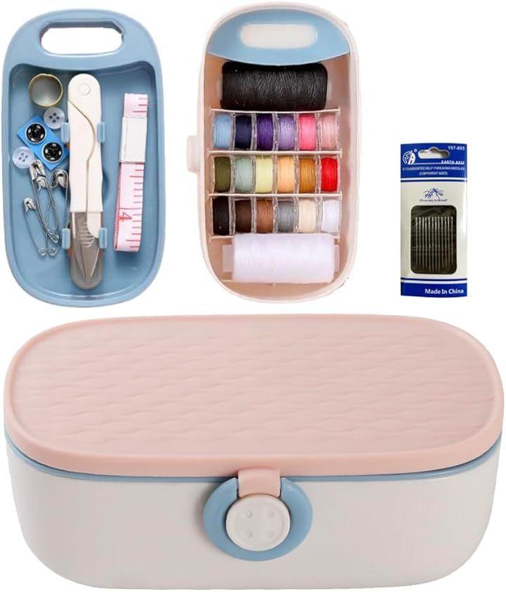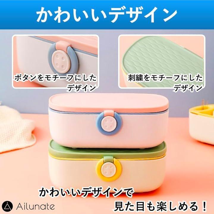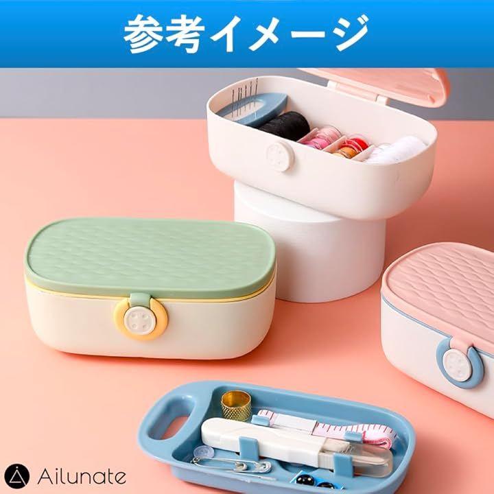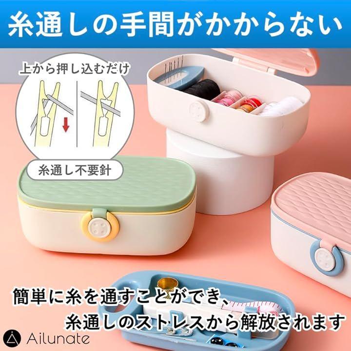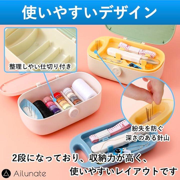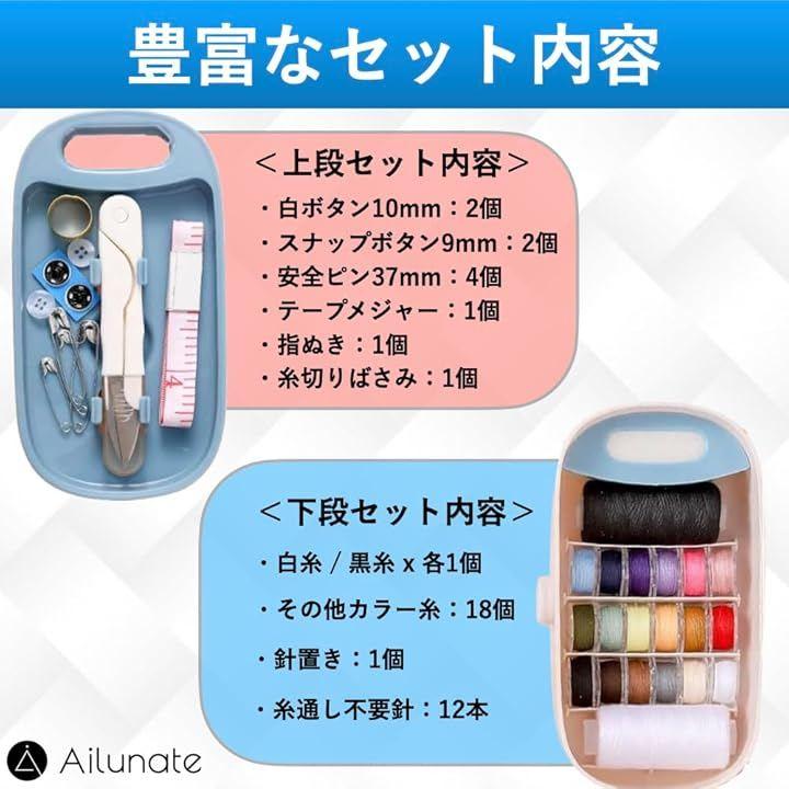 「豊富なセット内容」白ボタン10mm:2個、スナップボタン9mm:2個、安全ピン37mm:4個、テープメジャー:1個、指ぬき:1個、糸切りばさみ:1個、白糸 / 黒糸 x 各1個、その他カラー糸:18個、針置き:1個、糸通し不要針:12本