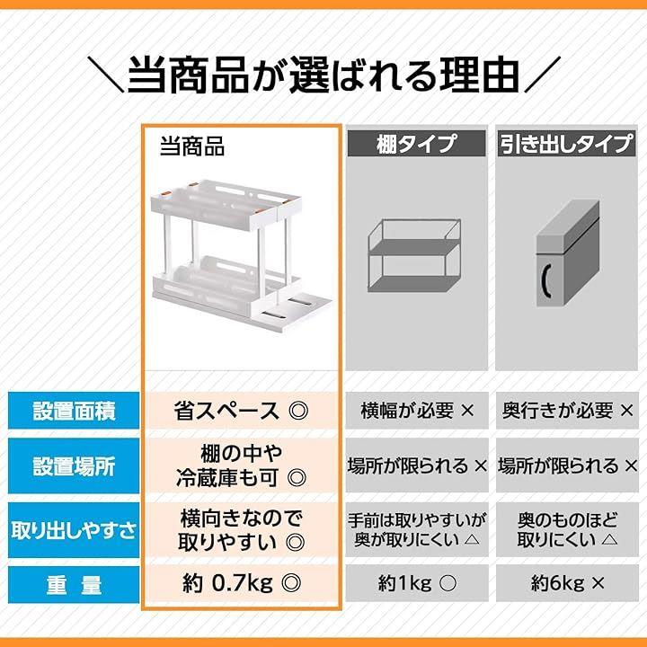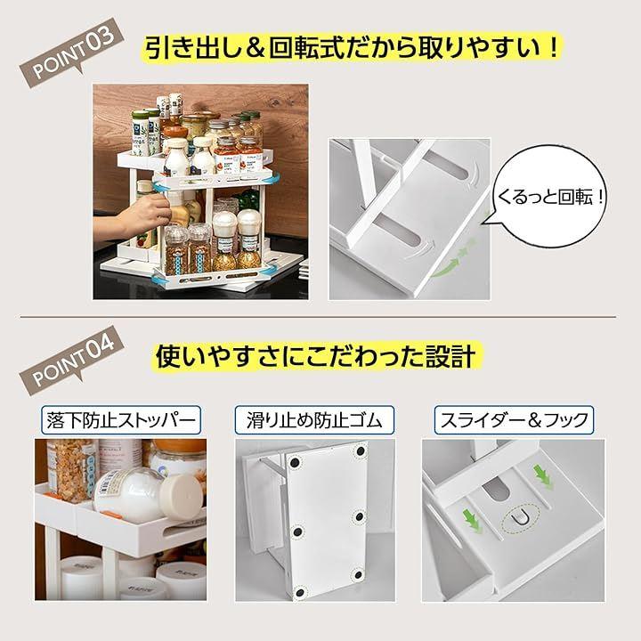「中身が取りやすい」トレイを引き出したら90度回転させるだけ。横向きになるので中身が見えやすく、前後の調味料に引っかかることなくスムーズに取り出せます。