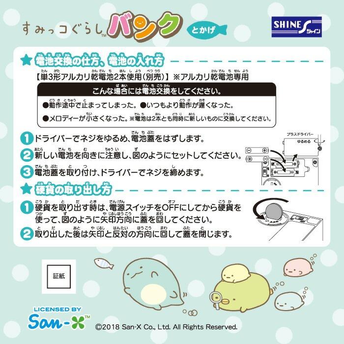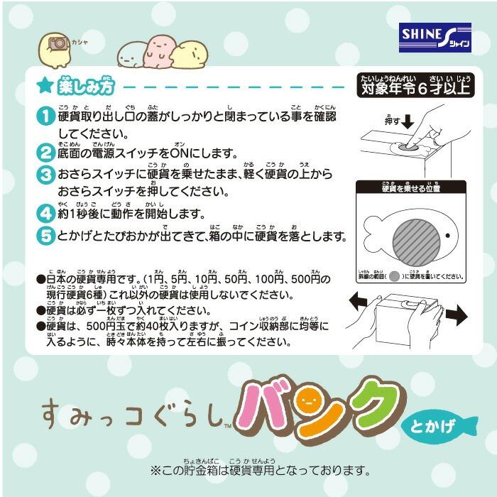 【商品仕様】商品名 :いたずらバンク(すみっコぐらしバンク とかげ)カテゴリー:貯金箱サイズ :W126xH103xD106mm対象年齢 :6歳以上電源 :単三型アルカリ乾電池2本使用(電池別売)メーカー :シャイン※1円から500円の全ての日本硬貨に対応しています。コインは500円硬貨で約40枚収納可能です。