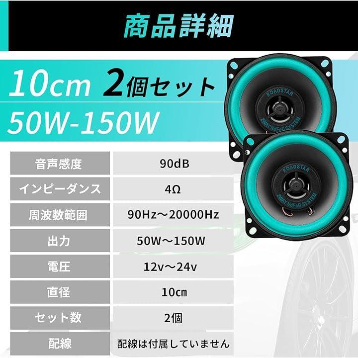 「商品詳細」内容:車用スピーカー2個 音声感度:90dB、インピーダンス:4Ω、周波数範囲 (Hz):90Hz-20000Hz、出力:50W-150W、電圧:12v-24v *本製品は現在、旧パッケージ(50~100W表記)と新パッケージ(50~150W表記)の商品が混在しておりますが、いずれの商品もメーカー確認済みで、実際には50~150Wまで安全にご使用いただけます。