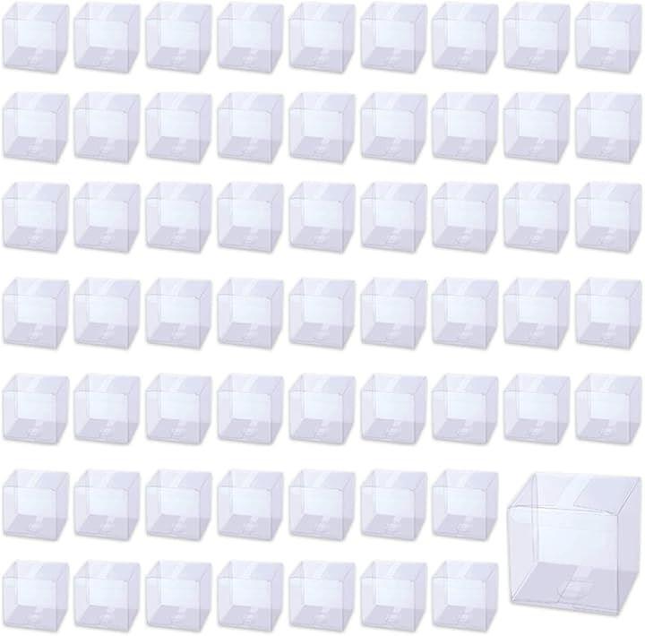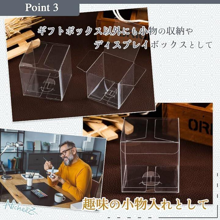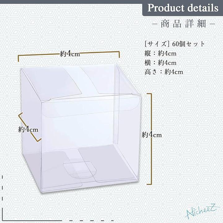 「商品内容」組立式透明ギフトボックス セット数:60個 サイズ:縦/約4cm 横/約4cm 高さ/約4cm *お届け時、商品表面を傷つけないための保護フィルムが貼ってありますので剥がしてお使いください。