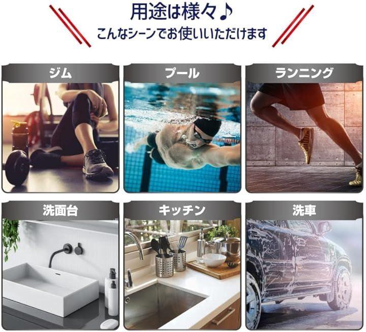 スポーツ、水泳、ジム、ヨガ、フィットネス、ランニング、登山、ビーチ、入浴、キッチン、洗車、アウトドア、旅行、など様々な場面で活用できます。