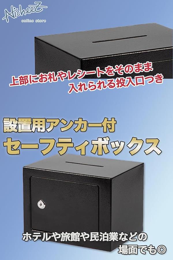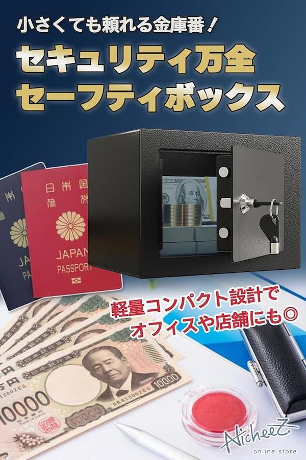 「商品詳細」自宅用小型金庫 サイズ:約 幅23cm x 奥行17cm x 高さ17cm(外寸) 重量:約3kg 素材:全鋼製スチール カラー:ブラック(レザー調仕上げ) 開閉方式:鍵式(専用キー2本付属) 固定方法:底面ボルト穴(設置用ネジ付)