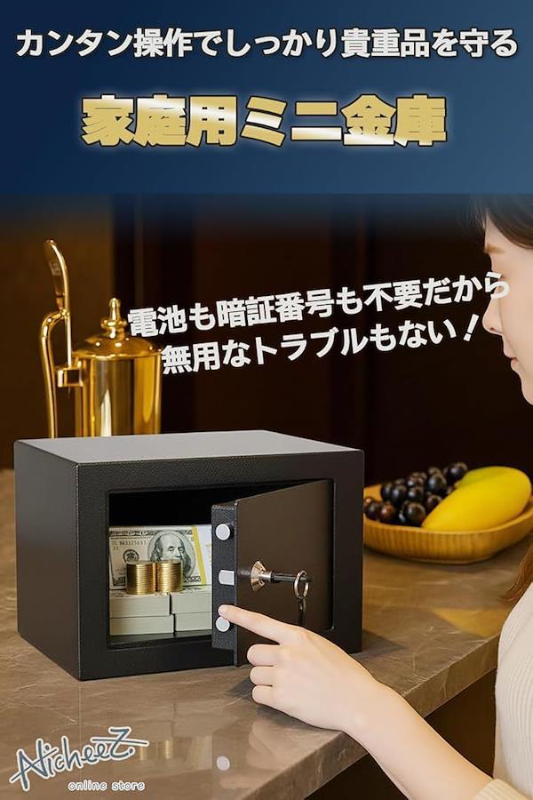 「鍵を回すだけ。電池も暗証番号も不要の小型金庫」通帳、印鑑、現金、思い出のアクセサリー。