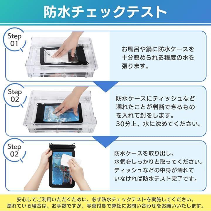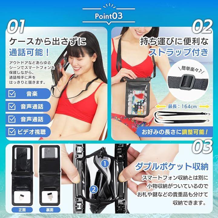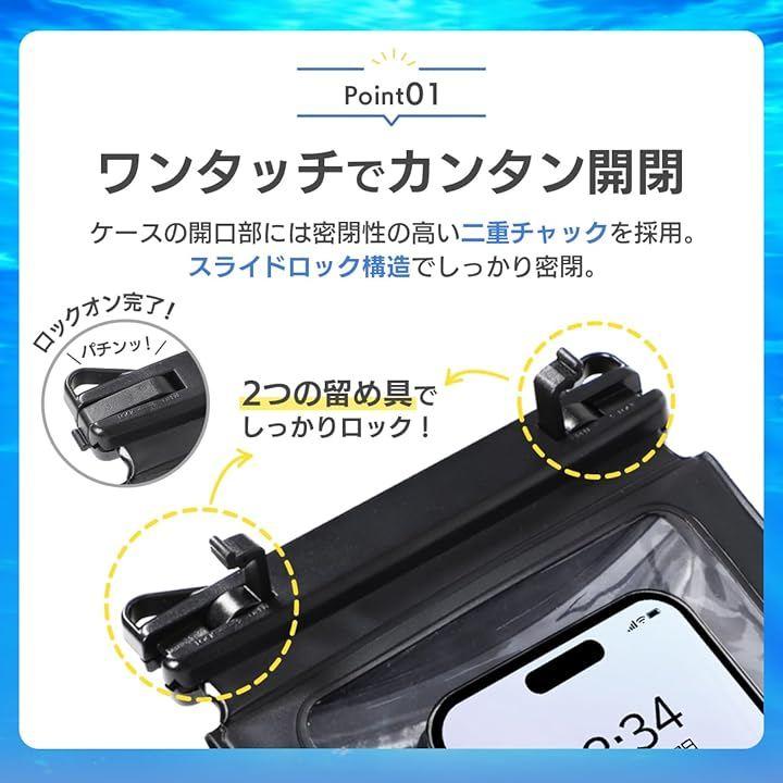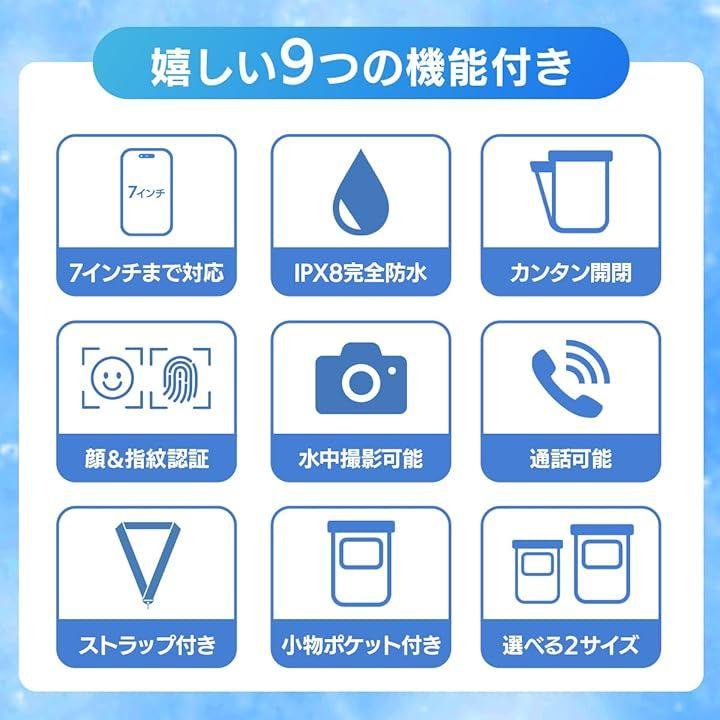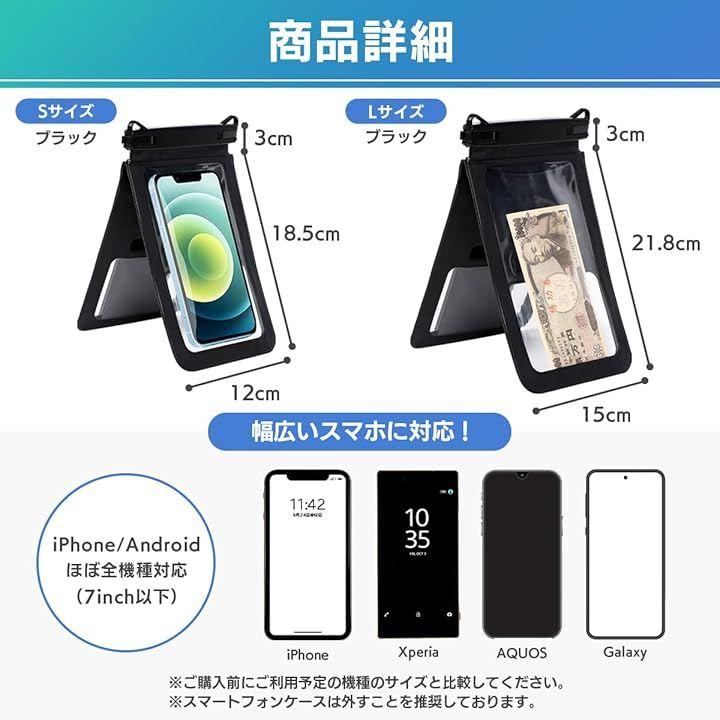 「カラー」ブラック「素材」PVC(IPX8防水性能)「サイズ」Sサイズ:12cmx18.5cm/Lサイズ:15cmx21.8cm「重量」Sサイズ:95g/Lサイズ:115g 「使用前の確認事項」使用する前に防水機能の確認を行ってください。
