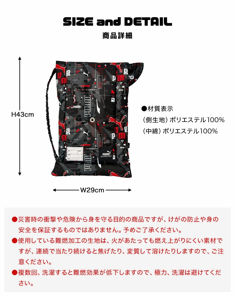 【防災ずきん】地震や火災などの災害時に衝撃や熱風から頭部や顔を守る防災ずきん。難燃加工の生地や中綿を使用しています。平常時はPUMAデザインの背もたれやざぶとんとして使えます。お揃いデザインの学童アイテムと合わせて新入学のお祝いにも◎お揃い柄でぴったりサイズのカバーも別売しております!