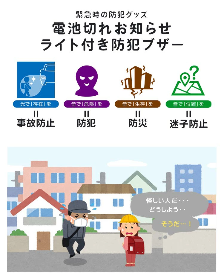 【電池切れお知らせライト付き防犯ブザー】新学期、新入学の準備にオススメ!大容量の音で、お子様を危険から守ります。電池不要のホイッスルも付いているので、万が一の災害時にも役に立ちます◎手元を照らす照射ライトや反射シール付きで夜道も安心!届いてすぐに使える乾電池付き!電池の残量が少なくなれば、LEDライトが点滅してお知らせしてくれます。