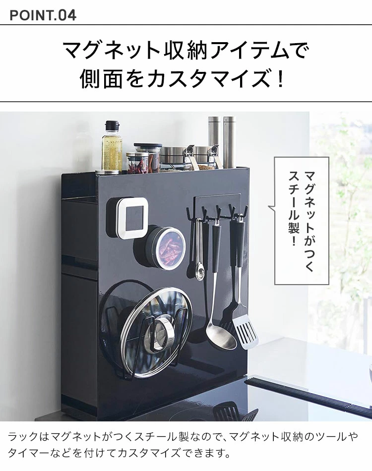 【隠せる調味料ラック 2段】油はねで調味料が汚れるのを防ぐ大容量の2段ラック。コンロ周りに溢れている調味料類の一括収納が叶います。上段にはスパイスなどの小さい調味料、下段には醤油や油などの液体調味料がたっぷり入ります。最上段には高さのある細々とした調味料やお塩や砂糖を入れたストッカーなどの収納に便利。表面はツルッとした光沢のある素材でお手入れも楽ちん!1つあるだけでコンロ周りが一気にすっきりしますよ♪