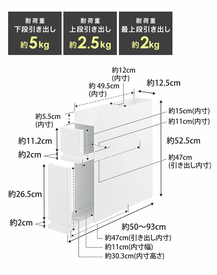 [ 内寸 ]下段引き出し:約 幅11 × 奥行47 × 高さ30.3cm上段引き出し:約 幅11 × 奥行47 × 高さ15cm最上段引き出し:約 幅12 × 奥行49.5 × 高さ5.5cm