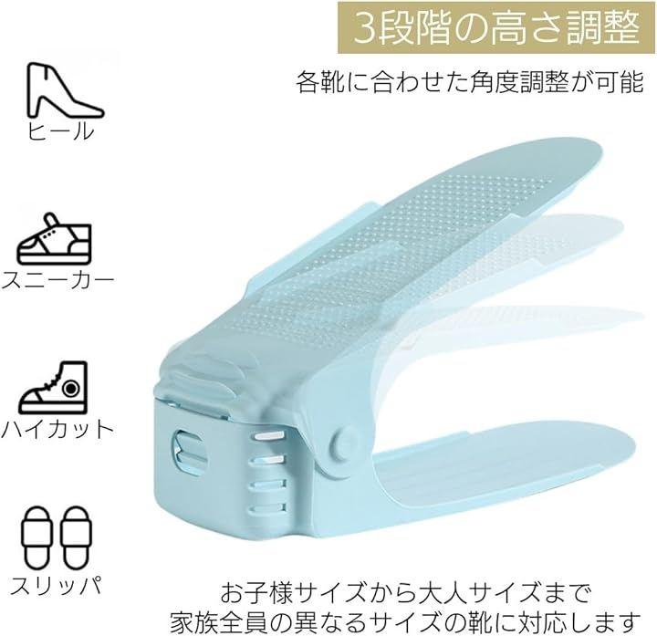 「スマートに収納、自由に調整」3段階の高さ調整で、ヒールからスニーカーまでフィット。