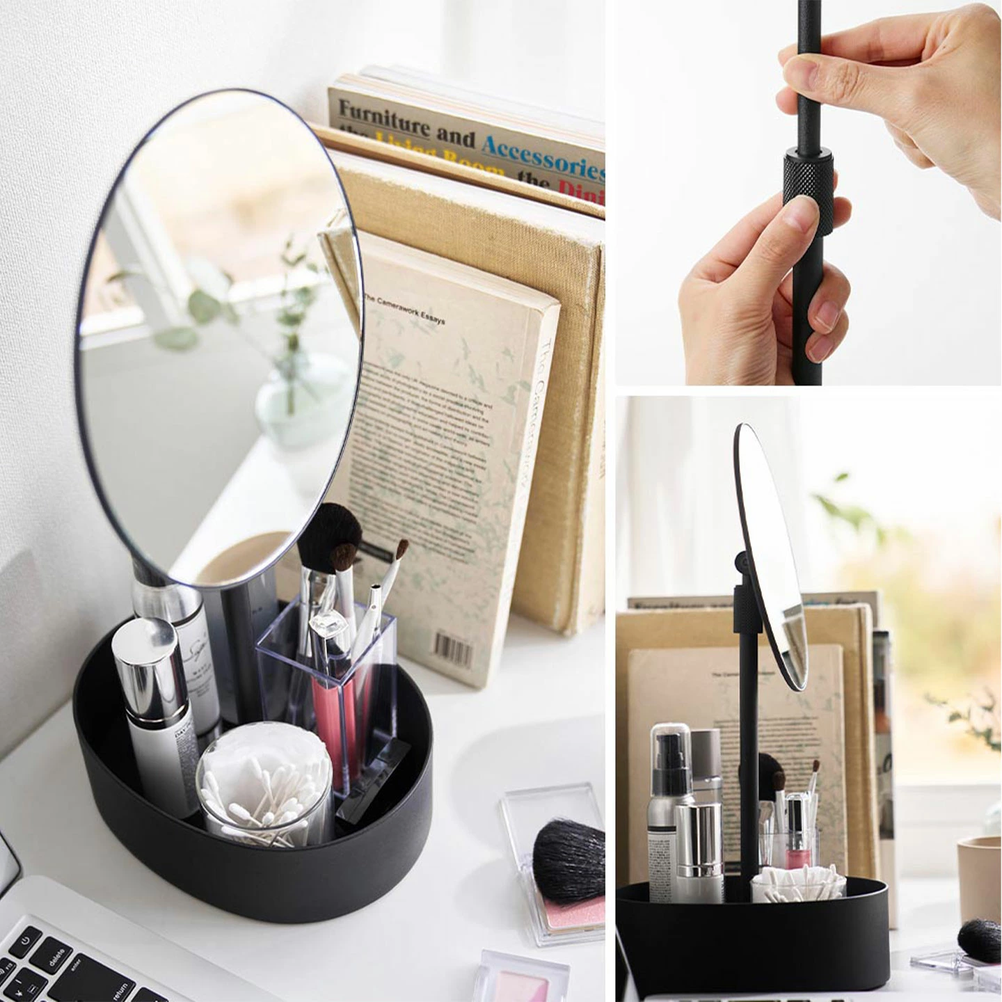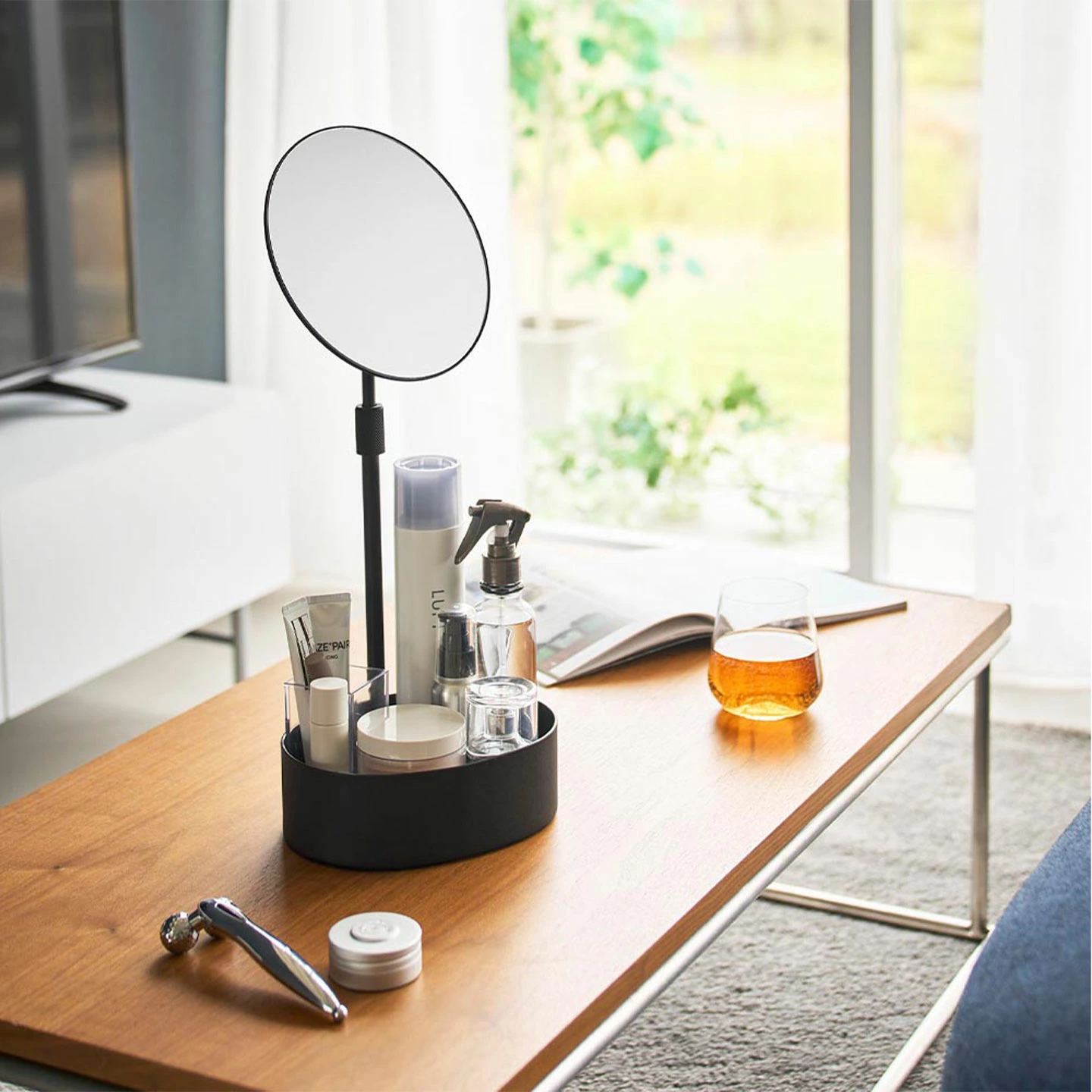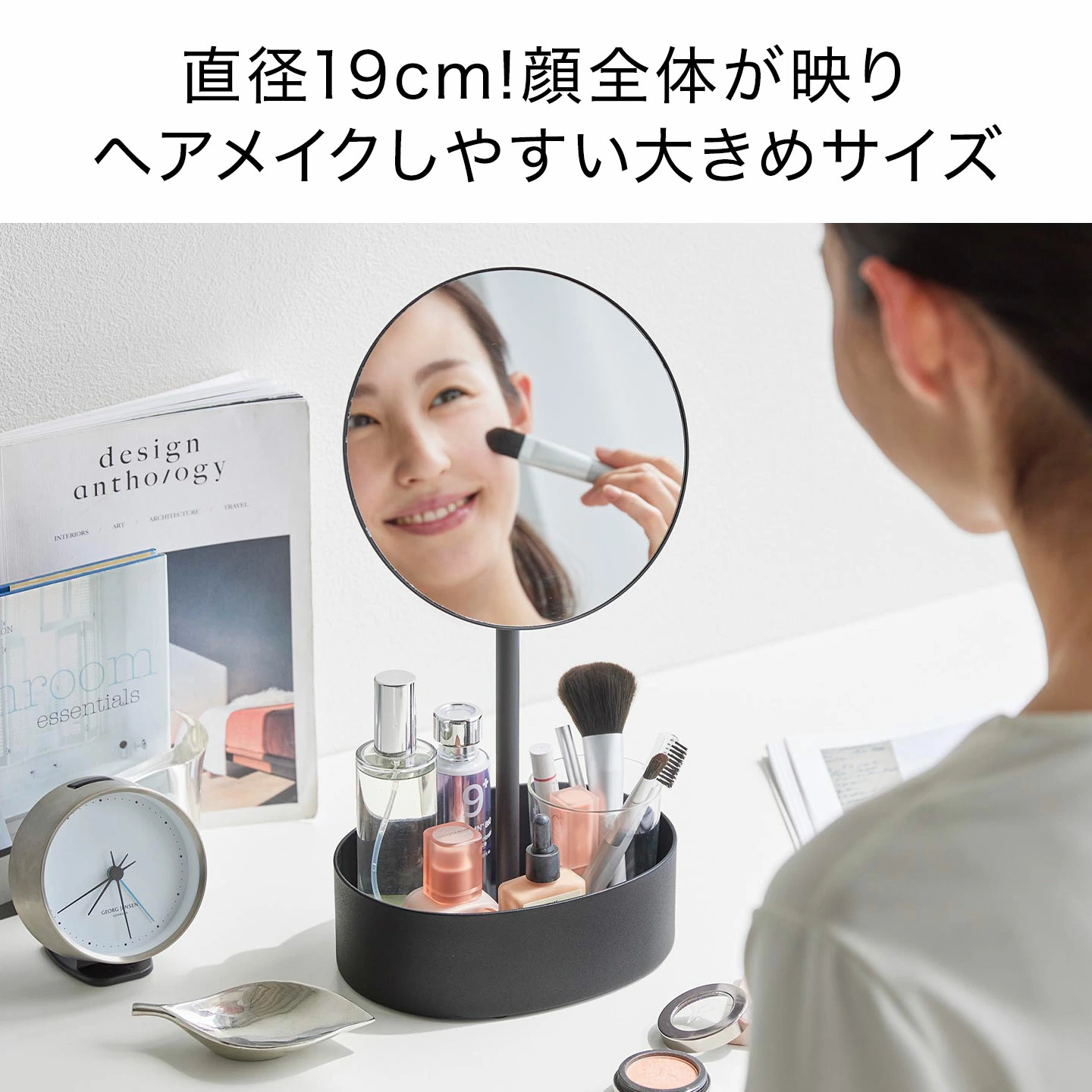 【高さと角度が調節できる収納付きスタンドミラー】高さと角度の調節ができる、収納付きスタンドミラーです。直径19cmの大きめミラーで顔全体が映り、ヘアセットやメイクがスムーズに行えます。収納部の向きを90度変えることで、狭い場所でもスリムに使用可能。ミラーの高さは最大55cmまで調節でき、ローテーブルでも使いやすい仕様です。また、支柱の固定位置を端にすることで、収納スペースが広々と活用できます。
