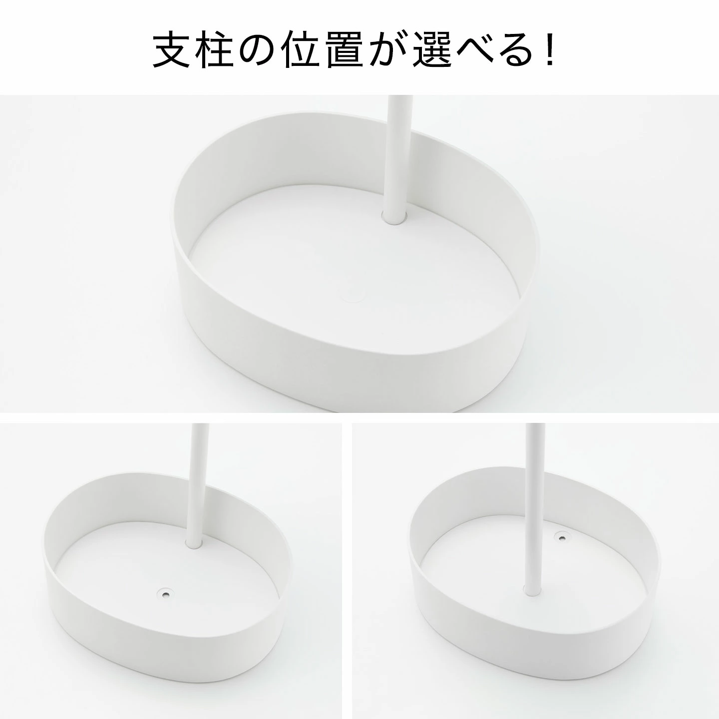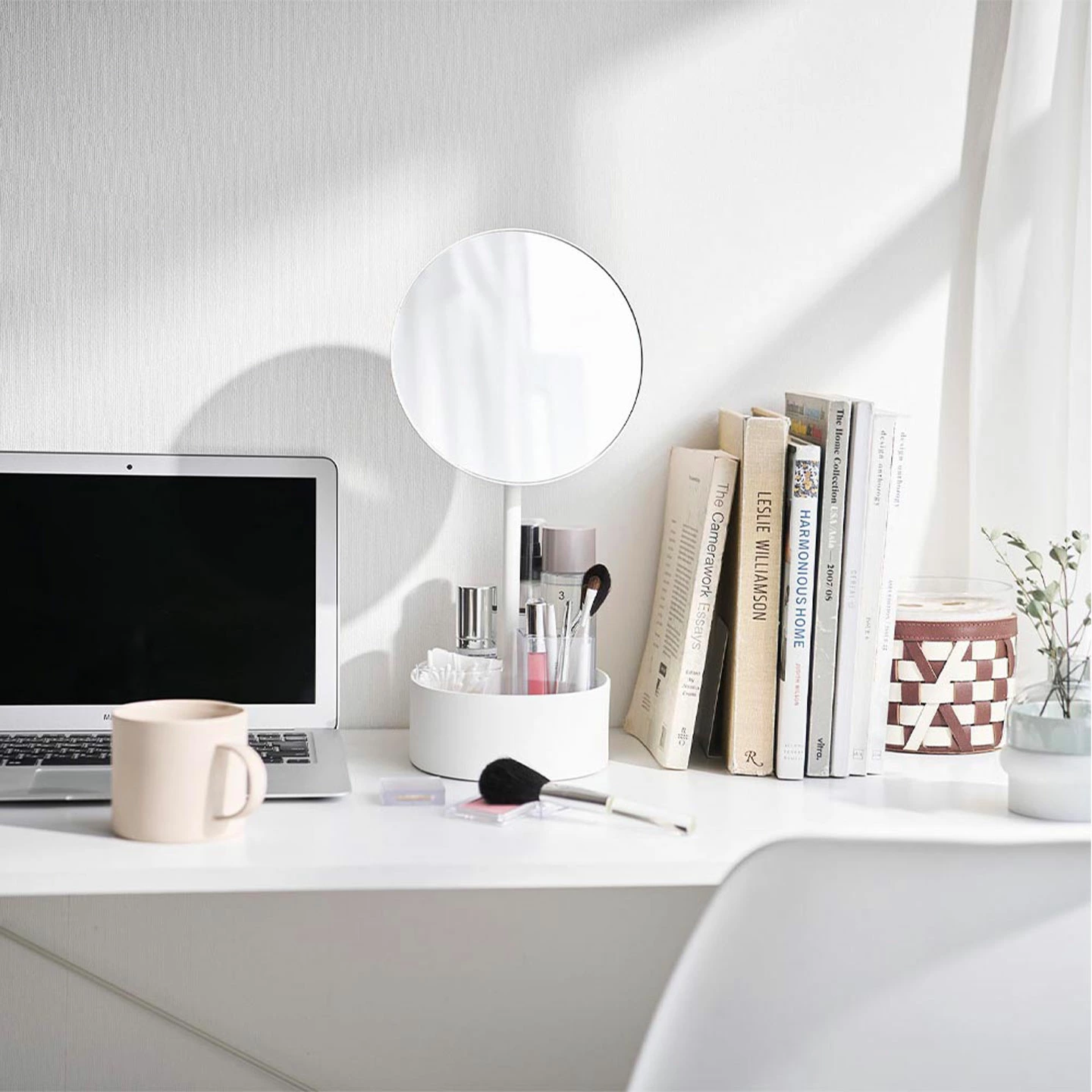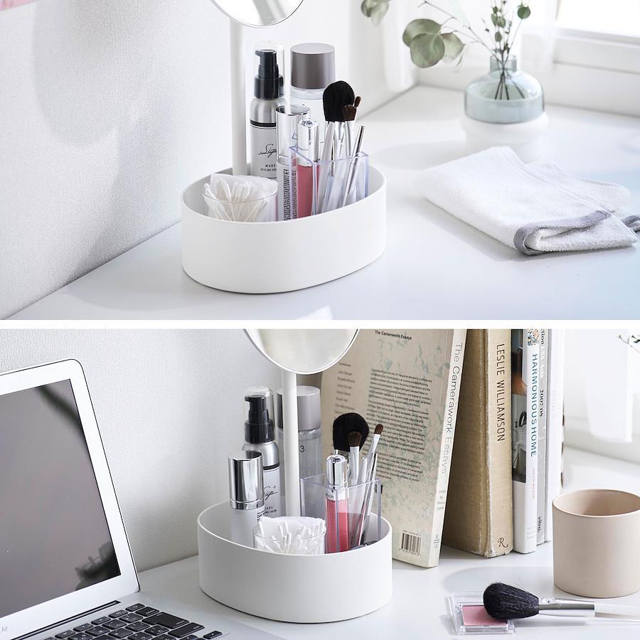 【高さと角度が調節できる収納付きスタンドミラー】高さと角度の調節ができる、収納付きスタンドミラーです。直径19cmの大きめミラーで顔全体が映り、ヘアセットやメイクがスムーズに行えます。収納部の向きを90度変えることで、狭い場所でもスリムに使用可能。ミラーの高さは最大55cmまで調節でき、ローテーブルでも使いやすい仕様です。また、支柱の固定位置を端にすることで、収納スペースが広々と活用できます。
