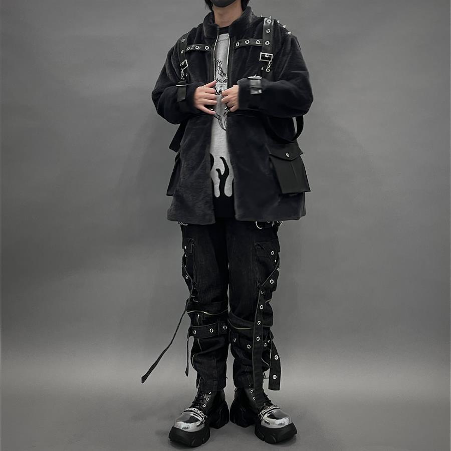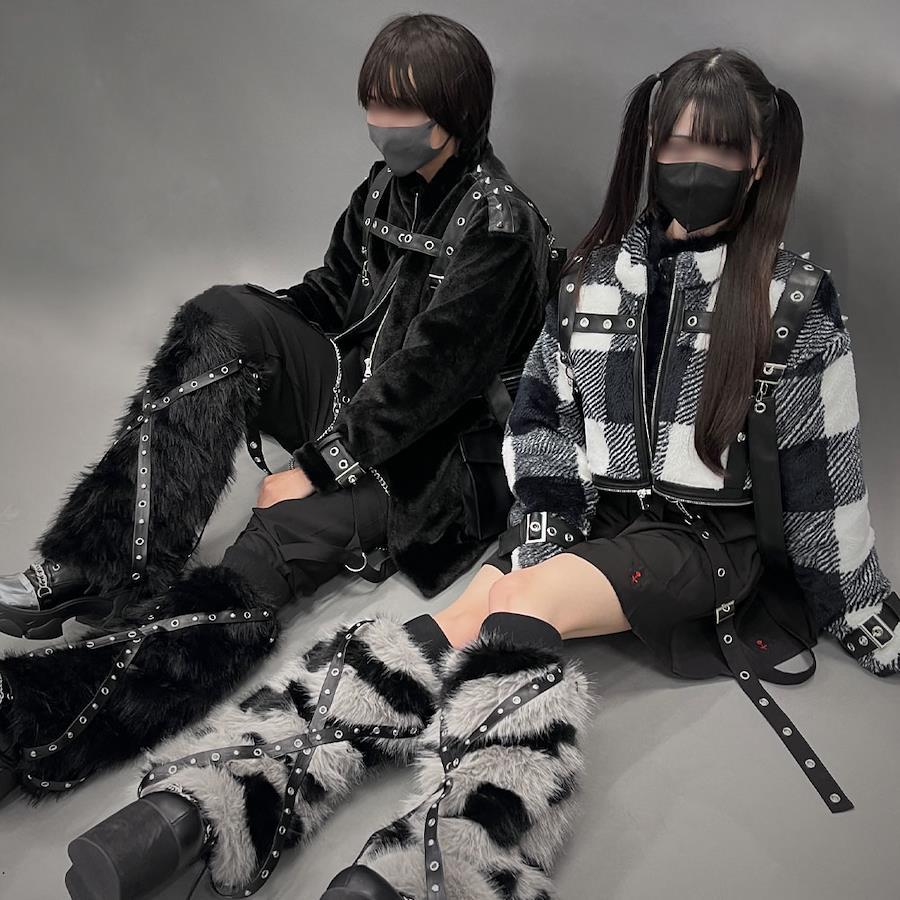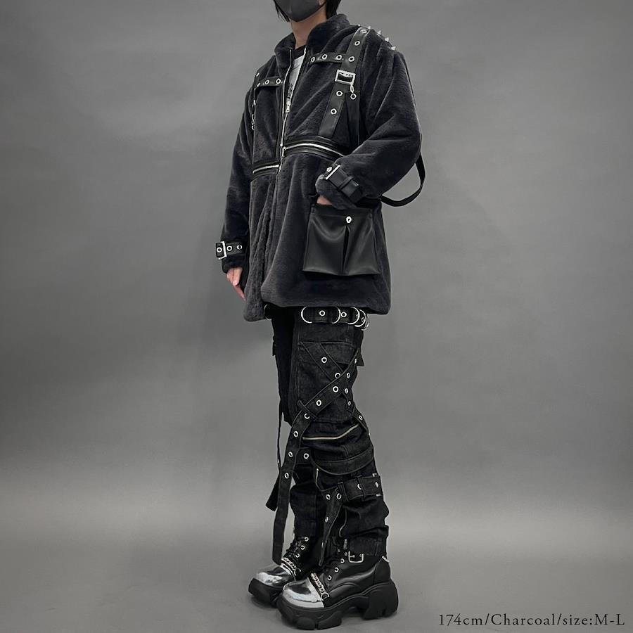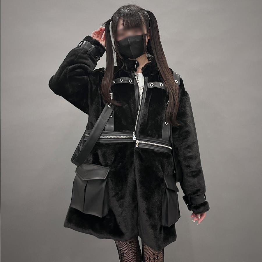 2WAYボンデージファーコート【デザイン】肩部分に金属スタッズ付きで、配色フェイクレザーベルトもデザインポイントになります。本体部分ファスナーでロング丈とショート丈に変換できます。カニカンで身頃のベルト取り外し可能になります【素材】厚みのあるファー生地を使用しています。裏地付きで、ファスナーで着脱可能【コーディネート】サブカル系のコーデにオススメのファーコートロング丈とショート丈2wayになりますので、男女問わず着用できます。《透け感》なし 《生地の厚さ》厚手 《裏地》あり 《伸縮性》なし《生産国》中国