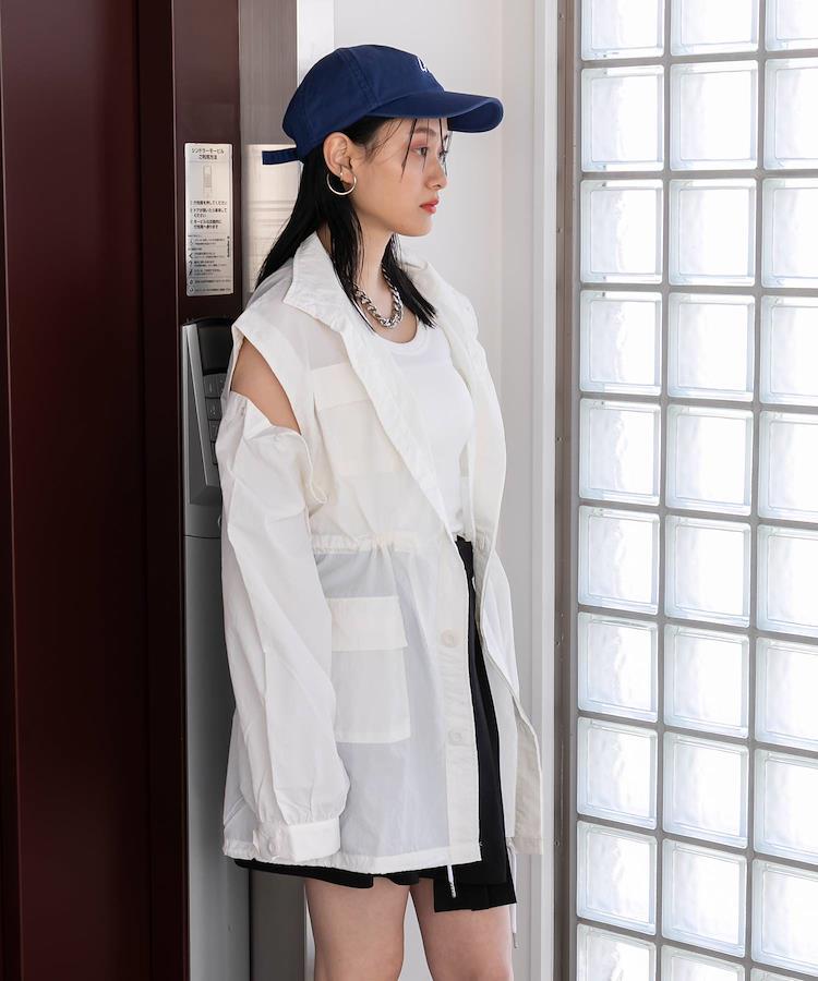軽いナイロン素材なのでしわも気になりにくい仕様に。袖はボタンで取り外していただけます。