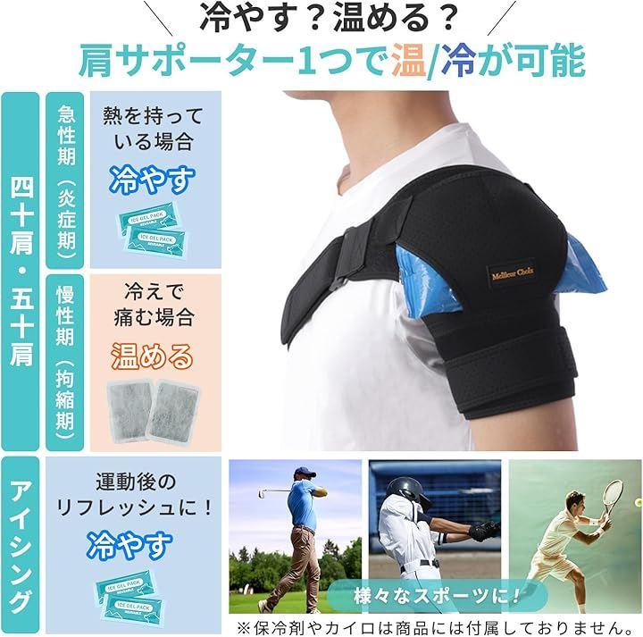 肩を固定せずに自然な動きを保ちながら、保冷剤やカイロを入れられる落下防止ポケット付きで冷却・温熱ケアが可能。