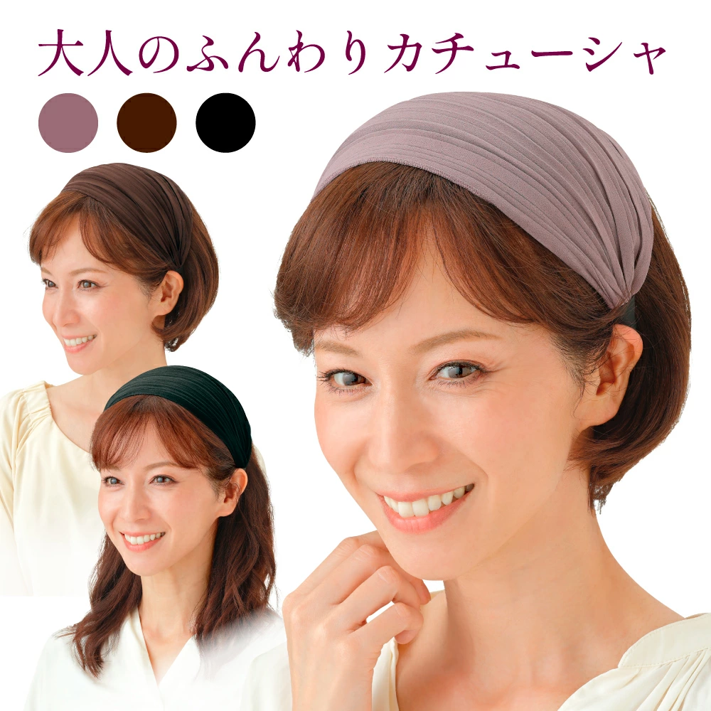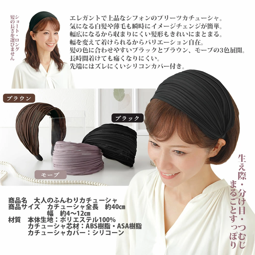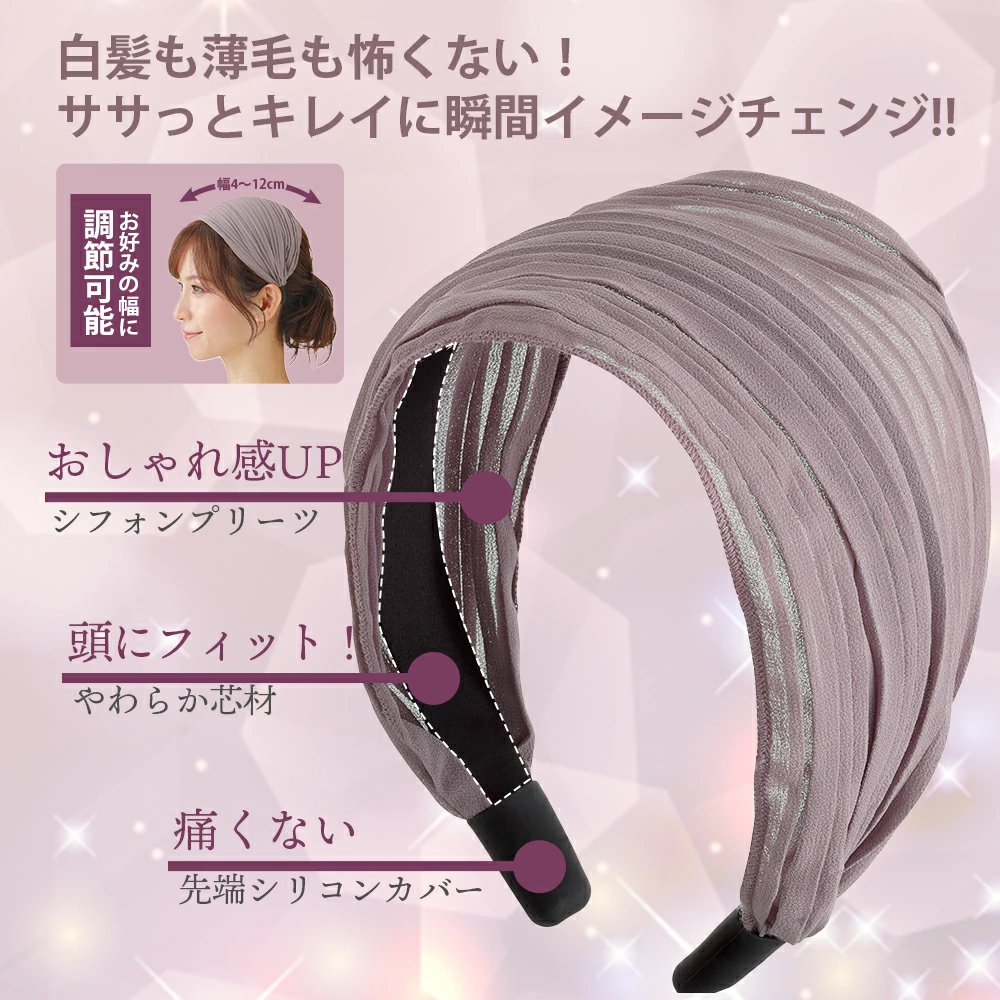 【商品情報】白髪も薄毛も怖くない!ササっとキレイに瞬間イメージチェンジ!!エレガントで上品なシフォンのプリーツカチューシャ。気になる白髪や薄毛も瞬時にイメージチェンジが簡単。幅広になるから収まりにくい髪形もきれいにまとまる。幅を変えて着けられるからバリエーション自在。髪の色に合わせやすいブラックとブラウン、モーブの3色展開。長時間着けても痛くなりにくい。先端にはズレにくいシリコンカバー付き。生え際・分け目・つむじ、まるごとすっぽりショート・ロング、髪の長さを選びません