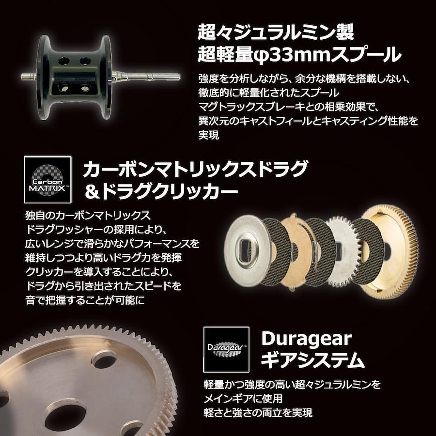 前作比平均約9%の軽量化+握りこみやすいエルゴノミックデザインを採用しRoxaniがリニューアル!Revo5の遺伝子を引き継いだ握りこみやすいエルゴノミックデザイン、カーボンハンドル搭載。前作からスプール径33mmを踏襲しつつ、自重、ベアリング数、ドラグ力などあらゆる性能をアップデート。親指を置くサムレスト部をハンドルアーム側にオフセットすることにより、ファイト時により深く力強く握りこむことが可能となり、力の分散を防止して力強く安定した巻き取りを実現。クラッチバーについては、パーミング時に誤って手のひらと干渉し“押してしまう”という誤操作を防ぐためにも左右非対称デザインを採用。独自の新素材C6カーボンをフレームとサイドプレートに採用。カーボン繊維で強化されたエンジニアプラスチックであり、強度と耐久性を犠牲にすることなく大幅な軽量化を実現。キャステイング時においてルアーがリリースされた瞬間からブレーキが確実に作用するため、向かい風での空気抵抗の大きなルアーの使用においても確実にバックラッシュを防ぐことが可能。また、軽量リグのピッチングやショートディスタンスのキャステイングにおいてもより快適にピンポイントを狙うことができるように。軽量かつ強度の高い超々ジュラルミンをメインギアに使用。軽さと強さの両立を実現した。Abu Garcia独自のカーボンマトリックスドラグワッシャーの採用により、広いレンジで滑らかなパフォーマンスを維持しつつより高いドラグ力をかけることが可能。また前モデルにはないドラグクリッカーを導入することでドラグから引き出されたスピードをクリック音で把握し、ラインブレイクを意識しながらやり取りが可能に。ハンドルアームには、高弾性のカーボン素材を積層構成することにより、高強度でかつ軽量化と感度向上を実現。長さはオールラウンドの使用と手首でのリトリーブを考慮してクランク型90mm長を採用。パームサイドプレートを開けるためのカムロックレバーは、サイドプレート下部に配置。カムロックレバーを“開”状態にした時は、レバーの爪部が突出するため、レバーの締め忘れを防止できる。