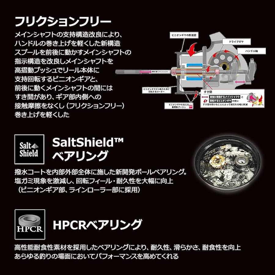 前作比平均14gの軽量化+コンパクト左右非対称ボディを採用しRoxaniがリニューアル!ZENON、Revoの遺伝子を引き継いだ左右非対称コンパクトボディ、カーボンハンドル搭載。撥水コートを内部外部全体に施した新開発ボールベアリングを採用することにより、回転異音の原因となる塩ガミ現象を激減。回転フィール・耐久性を大幅に向上させることに成功(ピニオンギア部、ラインローラー部に採用)高性能耐食性素材を採用したベアリングにより、耐久性、滑らかさ、耐食性を向上。あらゆる釣りの場面においてパフォーマンスを高めてくれる。従来のスピニングリールに搭載されていたドライブギアに比べ直径、最大117%(2500-4000番)を実現。これにより、耐久性の向上だけでなく、トルクフルな巻き上げを可能に。メインシャフトの支持構造改良により、ハンドルの巻き上げを軽くした新構造。大物でも『あと一巻き』を積極的に巻き上げ可能。スプールを前後に動かすメインシャフトの支持構造を大幅に改良し、 メインシャフトを高摺動ブッシュでリール本体に支持。回転するピニオンギアと前後に動くメインシャフトの間のすき間を無くす(フリクションフリー)ことにより、巻き上げを軽くした。従来のリールに採用されていたボディバー(側板)をボディに一体化することに成功。ボディ全体のサイズ・重量の最適化とワンピースのDuraMetal? (アルミニウムアロイ製)ボディの採用により、ドライブギアを一部品でサポートするため、軸心がぶれることなく最適なギアフィーリングの向上に貢献。釣種・釣法にあわせてドラグワッシャーの組付け順序を変えることにより、"Light"及び"Tough"の2通りの設定が可能。ハンドルアームには、高弾性のカーボン素材を積層構成することにより、高強度でかつ軽量化と感度向上を実現。