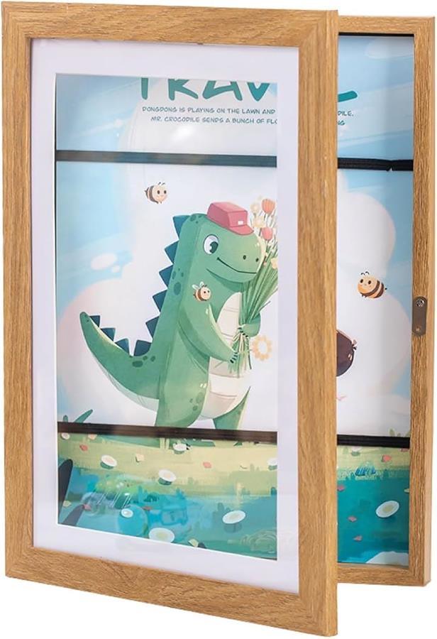 厚みのある構造なので、平面の絵だけでなく立体的な工作や油彩パネル、写真アルバム、手作りカレンダーなども飾れます。