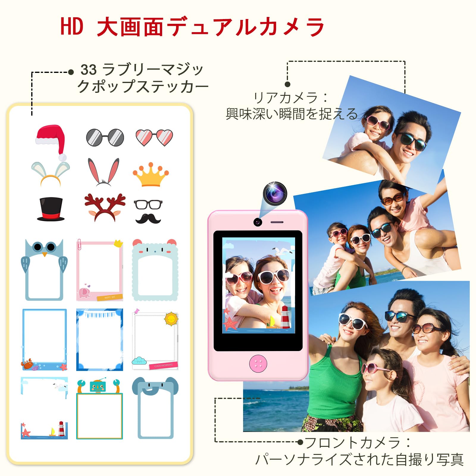 【アップグレードされたタッチスクリーン子供用携帯電話】この2.8インチのタッチスクリーン子供用スマートフォンは、学習でも娯楽でも子供にとって最良の選択です。 このおもちゃの電話には、デュアル カメラ、フォト アルバム、音楽プレーヤー (ヘッドフォン付き)、15 のパズル ゲーム、3 つの目覚まし時計、15 の興味深い壁紙、タイマー、ストップウォッチ、カレンダー、懐中電灯、歩数計、レコーダー、電卓、12/24 時間形式、等 3歳から8歳までの男の子と女の子へのクリスマス、誕生日、ホリデーギフトに最適です。【デュアルカメラ子供用携帯電話】子供用スマートフォンは、本物のスマートフォンと同じように写真を撮るためのデュアルカメラをサポートしており、前面と背面をすばやく切り替えることができ、カスタマイズが簡単です。 かわいいステッカーが34枚入っています。 子どもたちは、お気に入りのステッカーを選んで写真を撮り、家族や友達との人生の美しい瞬間や興味深い経験を記録します。 紛失を防ぐために、子供用携帯電話には持ち運びに便利な耐久性のあるコードが付いています。 お子様は簡単に自分撮りをしたり、家族や友達と一緒に楽しい写真を撮ることができます。 このおもちゃの電話は時間と楽しみを提供し、子供たちが写真のスキルを磨くのに役立ちます。【ヘッドフォン付き音楽プレーヤー】子供用携帯電話はMP3形式の音楽と3.5mmヘッドフォンジャックをサポートしています。 この子供用音楽プレーヤーは高品質のスピーカーを搭載しており、子供たちはヘッドフォンを使用して自分で音楽を再生したり、パーティーで家族や友人と一緒に楽しい音楽を楽しんだりできます。 3.5mmヘッドフォンジャックは、子供の静かな時間の勉強や音楽鑑賞に適しています。 USB充電ケーブルを介してコンピュータに接続し、曲をSDカードの「My Music」フォルダにコピーできます。 (注:音楽を転送するときは、電話の側面にあるオンボタンをオンにしてから電話の電源を切り、コンピュータに接続してストレージディスクを取り出し、Eドライブを開いて「マイミュージック」を見つけます)。【15種類の楽しいゲーム】子供用モバイルおもちゃ用の教育用ゲームが15種類内蔵されています。 女の子向けの着せ替えゲーム、バスケットボール、レース、男の子向けの金貨ゲームなど。 子どもたちは自分の好きなゲームを選ぶことができ、子どもの論理的思考能力、手と目の協調能力、反応能力を鍛えるのに役立ちます。 お子様の携帯電話のゲーム設定で各ゲームの音をオフにすることができるので、騒音を気にする必要がなく、退屈な時間を短縮するために長旅に非常に適しています。【お子様へのプレゼントに最適】2023年にアップグレードされた最新の子供用おもちゃの携帯電話は、お子様がテクノロジーの世界に足を踏み入れるための優れた入り口となり、独特の色、独特の雰囲気、高品質でお子様が手放せなくなります。 高解像度のカラータッチスクリーン、キュートで興味深い漫画のインターフェイス。 この偽の携帯電話は子供たちに人気のおもちゃで、3歳から12歳までの子供たちへのクリスマス誕生日旅行ギフトに最適です。 【免責事項】メーカーによる商品リニューアルに伴いパッケージ(内容量も含む)変更が行われた場合、新パッケージでお届け致します事ご了承願います。
