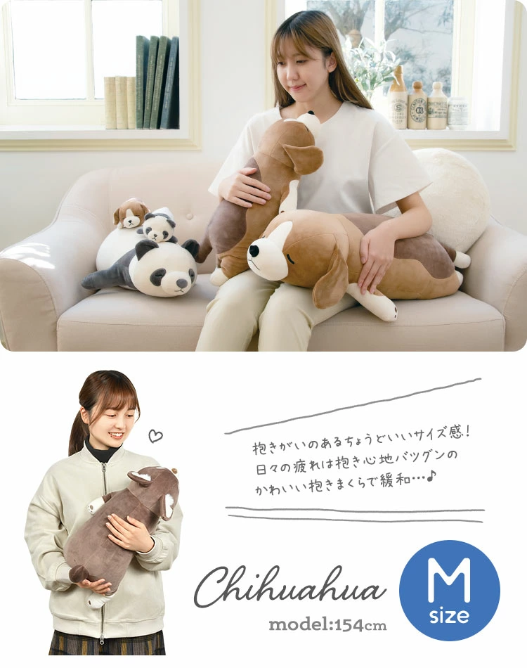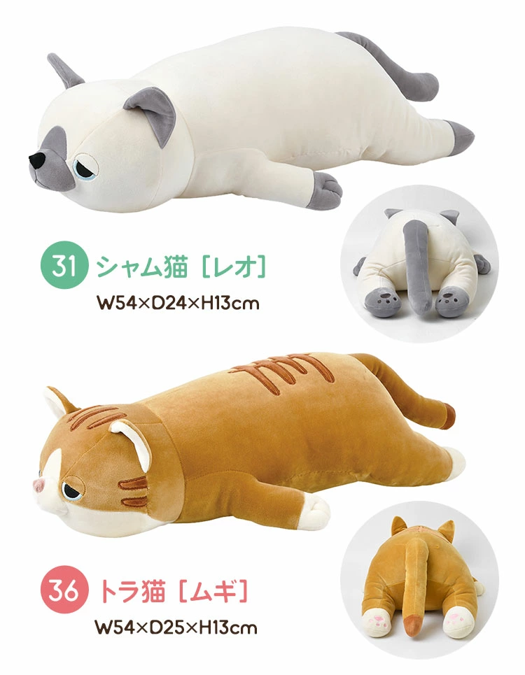 ■サイズ【犬】ゴールデン[ソラ] :長さ56×幅26×高さ14cmプードル[ショコラ] :長さ50×幅24×高さ12cmパグ[はな] :長さ52×幅23×高さ14cmビーグル[ビッキー] :長さ53×幅23×高さ14cmチワワ[ココア] :長さ54×幅27×高さ14cm柴犬[コタロウ] :長さ54×幅21×高さ14cm柴犬[コテツ] :長さ54×幅21×高さ14cmシュナウザー[ジョイ] :長さ49×幅22×高さ12cmブルドッグ[ブルル]: 長さ53×幅25×高さ13.5cmダックスフンド[チョコ]:長さ50×幅23×高さ13cm【猫】ミケ猫[ゆず]: 長さ49×幅21×高さ14cmスナネコ[スナコ] :長さ54×幅27×高さ14cmシャム猫[レオ]: 長さ54×幅25×高さ13cmトラ猫[ムギ]: 長さ54×幅25×高さ13cmスコティッシュ[まる]: 長さ50×幅23×高さ13cm【その他】シロクマ[ラッキー]: 長さ53×幅23×高さ16cmうさぎ[つむぎ]: 長さ50×幅20×高さ13cmたぬき[ぽんきち] :長さ55×幅22×高さ16cmカワウソ[くるり] :長さ54×幅23×高さ16cmオラウータン[ウータン] :長さ54×幅25×高さ13cmトラ[ラム・テン] :長さ56×幅23×高さ12cmゴリラ[ボンゴ]:長さ50×幅32×高さ15cmパンダ[リンリン]: 長さ53×幅23×高さ14cmうし[モーリー] :長さ55×幅23×高さ15cm