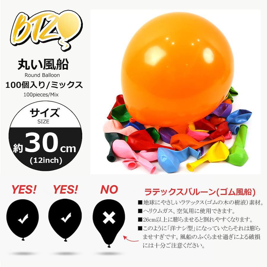 ■ポピュラーなラウンド風船100個入りのミックスバルーンパック。 ■風船カラー:12色アソート(予告無くアソート色数に変更が生じる場合があります予めご了承ください。)/内容物 :100個入り(粘着シール3枚、リボン2巻、バルーンチェーン1巻付き)/サイズ:12インチ(30cm)/ヘリウムガス、空気用に使用できます。/注:風船についている粉で、最も一般的なのは「タルク」です。人体に悪影響をおよぼすことがなく、ラテックスバルーンを製造する過程で、離型剤のような存在。ご理解をいただけた方のみご購入をお願いいたします。 ■スタンダードカラー(最も基本的な色)は皆様が持っている風船の色のイメージに一番近いカラーです。可愛いイメージを強く持っていますので、子供向きの装飾、例えば出産祝いやお誕生日会などに適しています。 ■BTZOバルーンの色彩・サイズ・シェイプバリエーションが豊富で、誕生日会だけでなく、結婚式や歓送迎会、卒園式、入園式、運動会、ハロウィン、クリスマス、展示会、リリース(放天)やお祭りなどのアトラクションや販促用としてもよく使われています。 ■ご購入後すぐに中身の確認をお願いいたします。商品の品質には万全を期しておりますが、万一不良・配送中の破損または注文内容が異なる場合は恐れ入りますが「注文履歴」→「出品者に連絡する」から弊店と連絡してください。再発送または返金等誠心誠意に対応させていただきます。受付は日本語、英語が話せるスタッフが対応しています。また、バルーン製品には、小さな部品が入っています。間違って飲み込む危険がありますので、6才以上のお子さまにお勧めします。