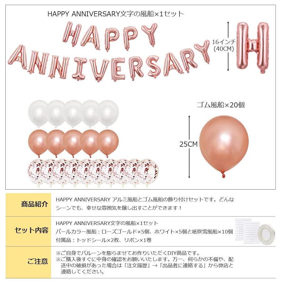 ■HAPPY ANNIVERSARY飾り付けセット:「記念日を大切にする男は好きですか?」と聞かれたら、たいていの女子はYESと答えるんじゃないだろうか。HAPPY ANNIVERSARYセットはいろいろなシーンで幸せな雰囲気を醸し出すことができます!操作簡単、コンパクトな飾り付けセットは1人でも飾れます。例え緊急状態も余裕で対応ができます!■セット内容:HAPPY ANNIVERSARYの風船セット×1、ゴム風船×10、紙吹雪風船×10、リボン×1巻、粘着シール×2■ ロマンチックな雰囲気を味わう:自ら1枚1枚の風船を壁に貼り飾って、心のこもったメッセージは何よりの思い出と喜びになります。ロマンチックで人を惹きつけ、雰囲気を盛り上げてくれる完璧な装飾です!■BTZOバルーンの色彩・サイズ・シェイプバリエーションが豊富で、誕生日会だけでなく、バレンタインデーのお祝い、結婚式や歓送迎会、卒園式、入園式、運動会、ハロウィン、クリスマス、パーティー、新年、バレンタイン、プロポーズ、告白、展示会、リリース(放天)やお祭りなどのアトラクションや販促用としてもよく使われています。■バルーン製品には、小さな部品が入っています。間違って飲み込む危険がありますので、6才以上のお子さまにお勧めします。【免責事項】メーカーによる商品リニューアルに伴いパッケージ(内容量も含む)変更が行われた場合、新パッケージでお届け致します事ご了承願います。