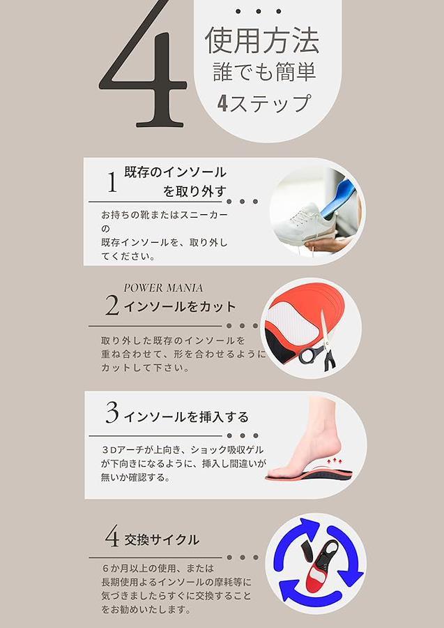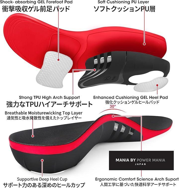 衝撃吸収、アーチサポート、過剰回内予防(かかとのサポート)などあらゆる角度から足を守る 中敷き となっております。