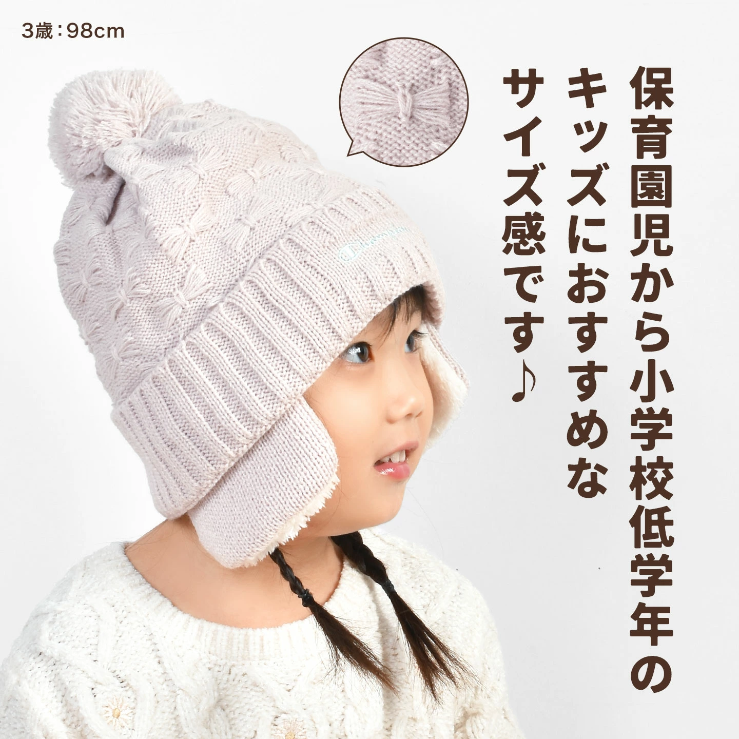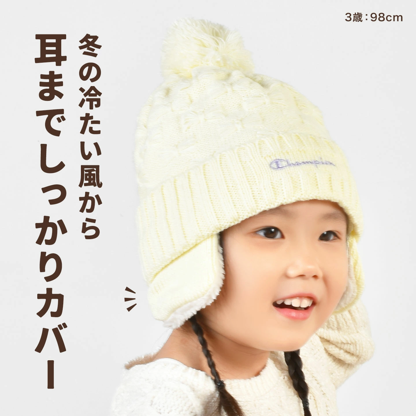 【リボンジャガード耳付きワッチ】リボンジャガードがとってもかわいい!Championの耳当て付きキッズニット帽。お顔が当たる内側部分は毛足の長いふわふわしたボア生地で被り心地も見た目もあたたか♪耳当て付きで真冬の通園通学やおでかけにもぴったり!保育園児から小学校低学年におすすめです♪