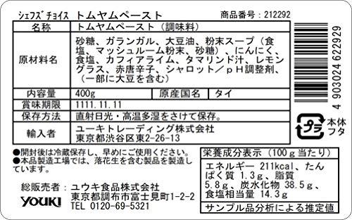 砂糖、ガランガル、大豆油、粉末スープ(食塩、マッシュルーム粉末、砂糖)、にんにく、食塩、カフィアライム、タマリンド汁、レモングラス、赤唐辛子、シャロット/pH調整剤、(一部に大豆を含む)