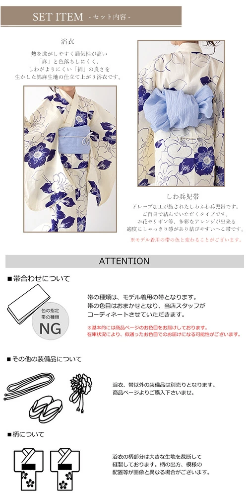 浴衣としわ兵児帯 2点セットの商品です。その他の小物は付属しません。●帯に関しましては、当店スタッフのおまかせになります。※帯はモデル着用の帯を基本的には浴衣に合わせてコーディネイト致します。