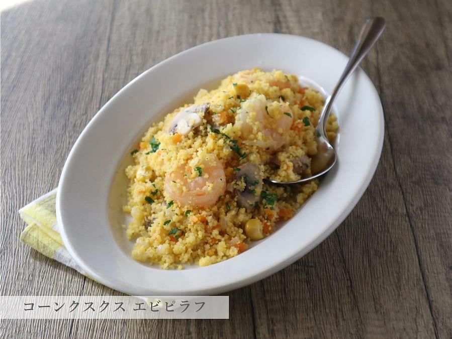 クスクス:65g、お湯:100cc クスクスをボウルに入れ、沸騰したお湯を注ぎ5分間蒸らしてください。