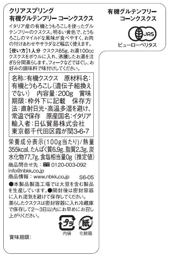 【原材料】有機とうもろこし(遺伝子組み換えでない) 【内容量】200g 【原産国】イタリア【栄養成分】100g当たり:熱量355kcal、たんぱく質6.9g、脂質2.3g、炭水化物77.7g、食塩相当量0g(推定値)【アレルギー】本製品製造工場では大豆を含む製品を生産しています。【食べやすいクスクス】イタリア産の有機とうもろこしを使ったグルテンフリーのクスクス。明るい黄色で、とうもろこしのマイルドな風味が食べやすく、お肉の付けあわせやサラダなど幅広く使えます。【使い方】1人分:クスクス65g、お湯100㏄ クスクスをボウルに入れ、沸騰したお湯を注ぎ5分間蒸らします。フォークなどでほぐし、お好みの調味料で味付けしてください。【重要】メーカーによる商品リニューアルに伴いパッケージ(内容量も含む)変更が行われた場合、新パッケージでお届け致します事ご了承願います。
