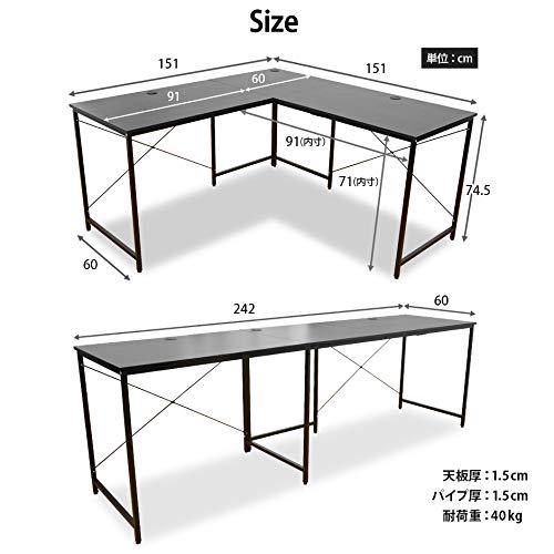 【広々デスク】作業の幅が広がるL字型・コーナーデスクです。左右の天板の長さは同じだから逆配置も向きを変えるだけで簡単。【I字もOK】天板は242cmワイド天板で使えるI字タイプとしてもご使用できます。パソコンを2台置きたい、横に作業空間が欲しいなど通常のデスクサイズでは物足りない方に最適。【メラミン加工】より長くご使用いただけるようにキズや水などに強い特殊な「メラミン加工」を施しました。【細部へのこだわり】気になる配線もスッキリの配線ホールカバー。安心、やさしい面取り加工済み。接地面の微妙な傾き・凹みによるガタツキを防ぐ「高さ調整アジャスター」付き(最大約1.5cm) ・充分な耐荷重で安心作業!【サイズ】L字型:幅60~151×奥行60~151×高さ74.5(cm) I字型:幅242×奥行60×高さ74.5(cm)板厚:1.5cm / パイプ:厚1.5cm ◆耐荷重:20kg ◆本体重量:約20kg 総重量:約22kg(梱包材等含む) ◆材質:パーティクルボード:メラミン加工 ◆機能:コーナー部を取り付け直すとI字型(直線型)デスクとしても使用可。※お客様組み立て式です。2人以上で作業を行ってください。