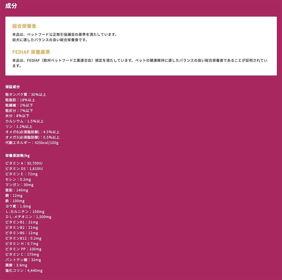 鶏肉、米、トウモロコシ、鶏脂、ビートパルプ、ビール酵母、コーングルテンミール、タンパク加水分解物、オーツ麦、乾燥卵、サーモン、サーモンオイル、ミネラル類、マンナンオリゴ糖(MOS)、キシロオリコ喜(XOS)、ユッカシジゲラ、スピルリナ原末エキナセア、オレガノ、こんにく、加水分解甲殻類(グルコサミン源)、加水分解軟骨(コンドロイチン源) 自然保存料 トコフェロールとローズマリー抽出物成分を