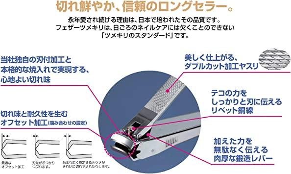 商品紹介●切れ鮮やか、信頼のロングセラー。 こだわりの材質と切れ味を突き詰めた構造。●日ごろのネイルケアには欠くことのできない、フェザーが造り上げた「ツメキリのスタンダード」です。●通常の刃付け後、更に仕上げの刃付けを施す独自の二段階の工程を踏んでいます。●本格的な焼入れ処理をした刃は、強度と弾力をあわせ持