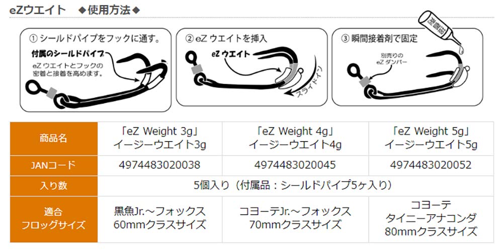 雷魚用中空フロッグのダブルフックに、だれでも簡単に後方重心にウエイトを取り付けられます。ダブルフックに付属のシールドパイプをセットして、そこにeZウエイトをはめ込み瞬間接着剤で固定。シールドパイプを用いることで確実な接着が可能です。