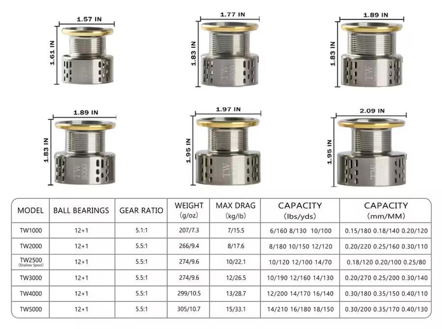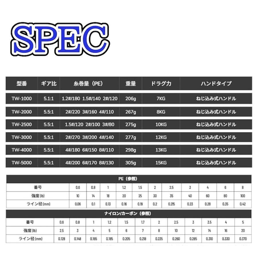 スピニングリールTWシリーズ。【ギア比】:5.5【最大ドラグ力(kg)】: 12【自重(g)】: 277【標準糸巻量PE(号-m)】: 2-270、3-200、4-140【ベアリング数(BB/ローラー)】:12/1※ご確認ください 当商品は海外製品であり、国産製品ほどの精度の高さがございません。特に本体重量や個体差のバラつきを確認しております。 本体重量について、カタログに表記しているものより若干重いことがございます。 個体差について、スタッフによる確認と調整を行ったものを販売しております。 上記内容をご理解いただいた上でご検討いただけましたら幸いです。