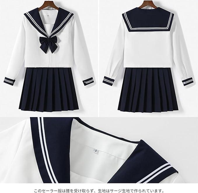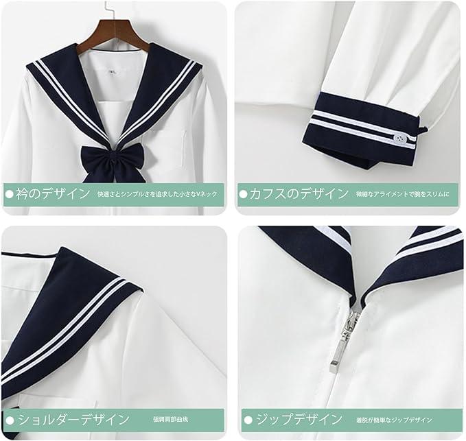 【デザイン】白シャツはゆったりとした短めの丈、プリーツスカートは体型の黄金比を強調するようにデザインされたちょうど良い丈です。セーラー服は白シャツが単調になりすぎないように関西襟と小さなポケットをつけ、プリーツスカートは変形しにくいように高温でアイロンをかけています。紺色リボンは、ガーリーな雰囲気で可愛らしい視覚効果をプラスしています。 シャツのステッチもきちんと繊細で、色あせしにくいです。