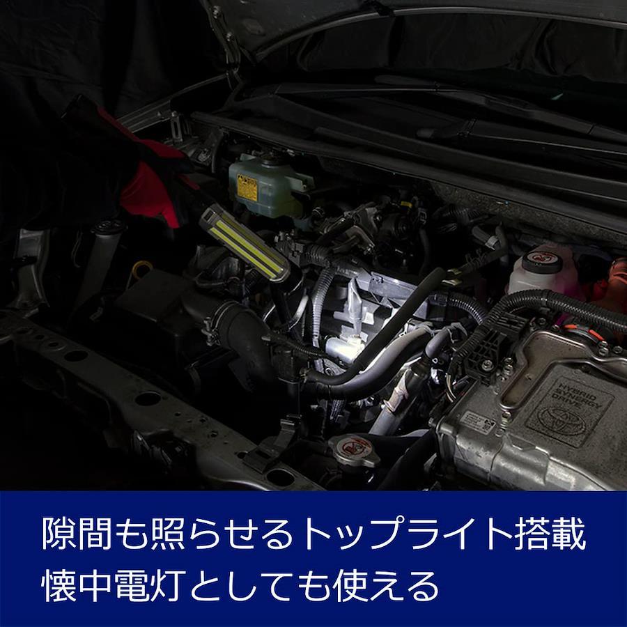 3つの面発光 (COB) LEDによる超ワイドな照射の、USB充電式バータイプワークライト【COB LED】多数のLEDチップを密集して基板に直接実装した光源。多灯式に比べ多重影ができにくく、照射範囲も広い特長を持つ【インスタントオフスイッチ】点灯後、一定時間経過後にスイッチを押すと、どのモードからでも一回の操作で消灯できる【トップライト】ハンディトーチとしても使用可能【バッテリーインジケーター / チャージングインジケーター】充電状態や電池残量を表示【Lowバッテリーインジケーター】電池が無くなる前にメインライトが点滅してお知らせダブル背面マルチフックダブル背面マグネットマグネット付き充電スタンド照射角度215度メイン3段階調光機能充電スタンドに差すだけの簡単充電本体に直接充電も可能フロントプッシュスイッチサイズ:約幅39.1×奥行33.5×高さ352mm、本体重量:約360gセット内容・付属品:本体、専用充電スタンド、マイクロUSBケーブル (50cm)、専用ACアダプター (5V/2A)、専用充電池 (内蔵)明るさ:High/1100ルーメン、Mid/680ルーメン、Eco/300ルーメン、Top/100ルーメン、使用電池:専用充電池 (Li-ion)実用点灯:High/6時間、Mid/10時間、Eco/27時間、Top/49時間機能:2m落下耐久、耐塵・防滴仕様 (IP64準拠)、最大照射距離:約37m (Highモード)