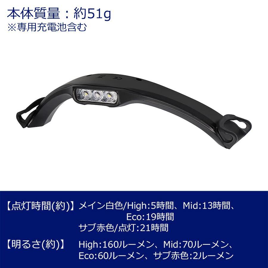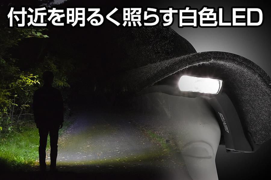 装着できる帽子のツバ幅:168~180mm装着できる帽子のツバ厚:2.5~5.0mmサイズ:約幅168.3×奥行86.5×高さ50.5mm、本体重量:約51g (電池含む)セット内容・付属品:本体、マイクロUSBケーブル (20cm)、ネックストラップ、専用充電池 (内蔵)明るさ:High/160ルーメン・Mid/70ルーメン・Eco/60ルーメン、赤色LED/2ルーメン、使用電池:専用充電池実用点灯:High/5時間、Mid/13時間、Eco/19時間、赤色LED/21時間機能:1m落下耐久、防滴仕様 (IPX4準拠)、最大照射距離:約38m