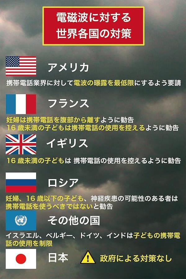 アメリカ、イギリス、フランス、ロシア、その他の先進国は、16歳未満の子供の携帯電話の使用を制限したり、妊産婦の腹部から携帯電話や電磁調理器などを離す様に勧告しています。