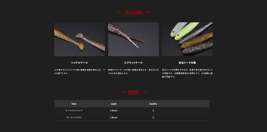 "ただ巻きでもミドストでも強く複雑な波動を発生させ、バスを魅了させる【ピーストンシャッド (PEACETON SHAD) 2.8インチ】""縦向きツインテール(スプリットテール)が弱い波動を発生させ、群れからはぐれた魚を演出させる【ピーストンフライ (PEACEON FRY) 2.8インチ】"